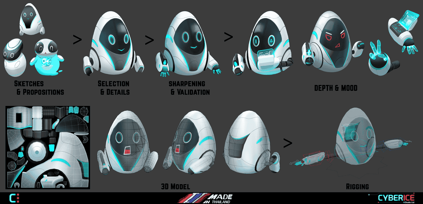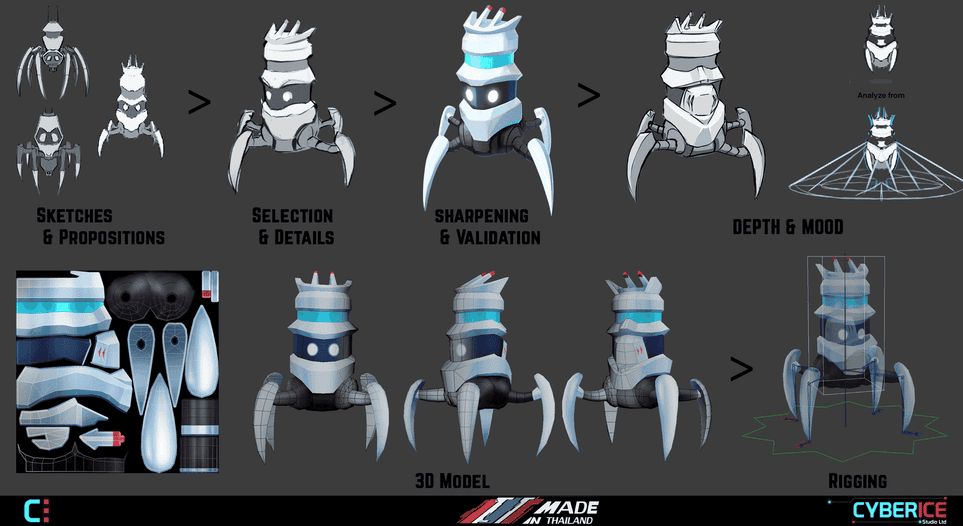 graphic sketches to the very final 3D models and animations to be used in the game.